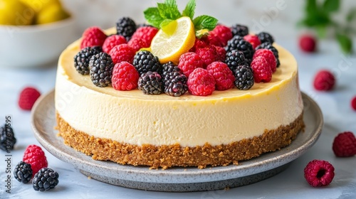 Delicious Creamy Cheesecake Topped with Fresh Berries and Lemon