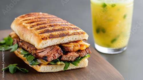 Delicious Cuban sandwich with grilled beef, fresh herbs, and refreshing drink