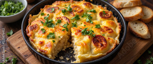 Delicious endive gratin served with bread on wooden board, family feast