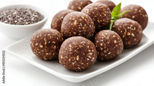 Delicious energy balls made from oats, dates, and cocoa powder, coated with sesame seeds, arranged on a white plate with chia seeds in the background
