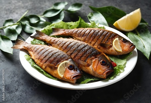 Delicious Fish dish with lemon and salad, Baked or fried salmon or tuna, seafood Healthy concept