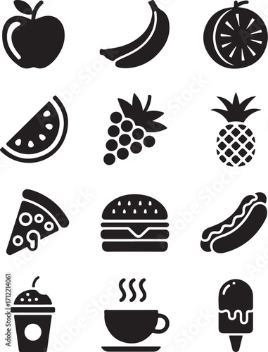 apple, banana, orange, watermelon, grape, pineapple, pizza, burger, hot dog, drink, hot drink, ice cream, fruit, snack, fast food, dessert, beverage, icon, set, collection, design, illustration, graphic, symbol, clip art, vector, simple, modern, flat, outline, black, white, food, meal, treat, refreshment, appetising