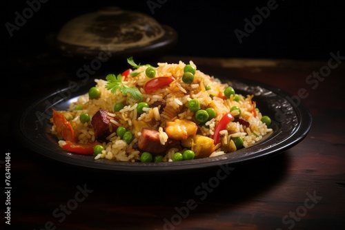 Delicious fried rice on a rustic plate against a dark background