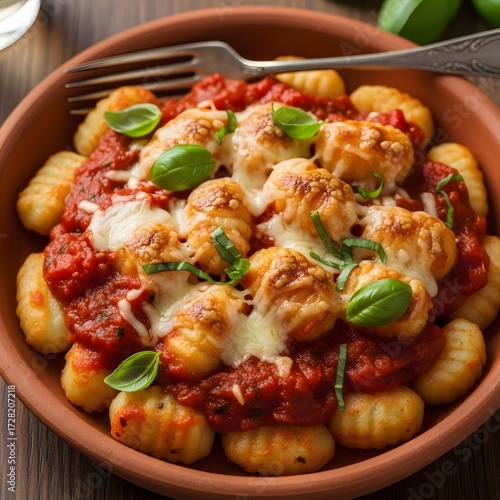 Delicious gnocchi dish with tomato sauce and basil in a rustic bowl on a wooden table top view