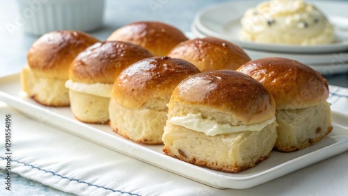 Delicious golden-brown buns with a smooth vanilla cream filling, artfully arranged on a white plate against a bright, light background.