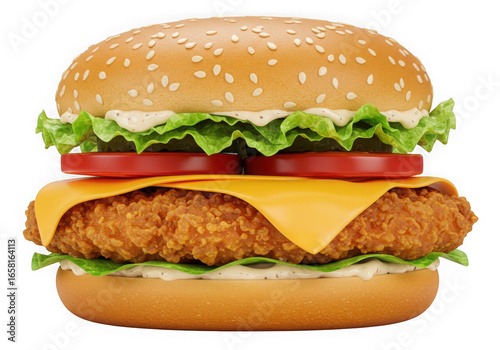Delicious gourmet chicken burger with melted cheese and fresh toppings on sesame seed bun transparent background
