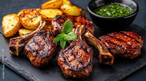 Delicious grilled lamb chops served with roasted potatoes and a fresh herb sauce on a black slate plate.