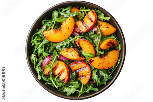 Delicious grilled peach salad with arugula and red onion recipe, healthy summer meal, food photography isolated on transparent background