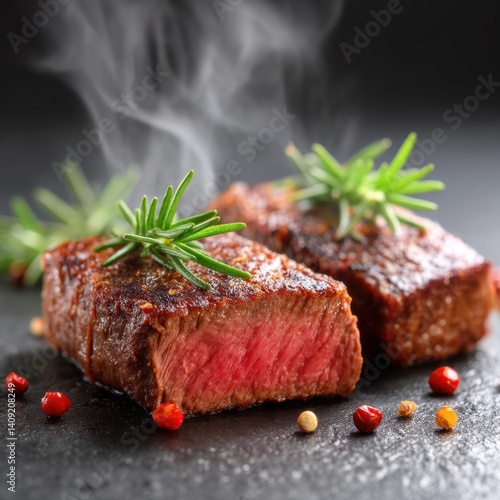 Delicious grilled steak cut with rosemary and pepper on a black stone plate a culinary masterpiece for food enthusiasts and gourmet adventurers