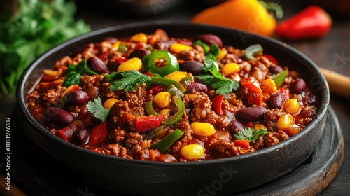 chili con carne, chili, food, hot, spicey, meat, beef, bean, vegetable, pepper, stew, delicious, homemade, dinner, lunch, meal, cookery, mexican food, traditional, red, hearty, comforting, rustic, cilantro, parsley, cooking, culinary, ingredient, closeup, background, topview, copy space, nobody