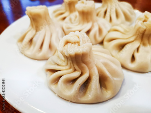 Delicious homemade Georgian traditional steamed dumplings called Khinkali filled with meats, coriander and meat's broth.