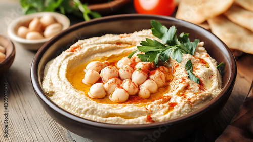 Delicious hummus served in bowl, garnished with chickpeas, olive oil, and parsley, accompanied by pita bread and nuts, creating warm and inviting atmosphere