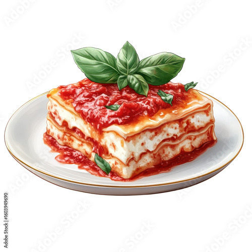 Delicious Italian Lasagna Illustration with Tomato Sauce Basil Leaves on a Plate Gastronomy on transparent background