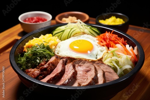 Delicious Korean bibimbap dish with rice, vegetables, and fried egg