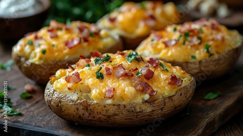 Delicious loaded baked potatoes with cheese and bacon rustic kitchen food photography cozy environment close-up perspective