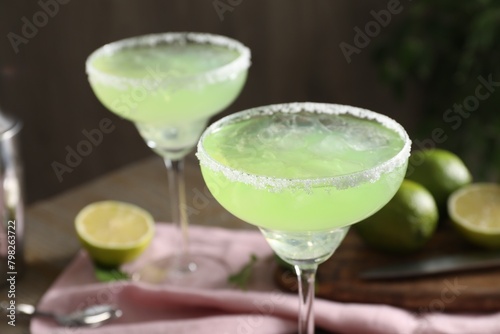 Delicious Margarita cocktail in glasses on table, closeup
