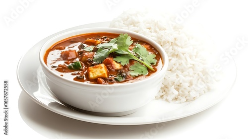 curry, indian food, rice, cilantro, coriander, spice, cookery, food, meal, dinner, lunch, eatery, bowl, plate, white, isolated, dish, vegetarian, healthy, traditional, tasty, delicious, aromatic, epicure, cooking, fresh, herb, favor, flavorful, ethnic, culture, india, side dish, closeup, studio shot, cut-out, background, ready to eat, food photography, culinary, appetising, cooked, served