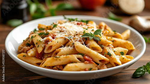 Delicious penne pasta served with fresh herbs and cheese on a rustic wooden table