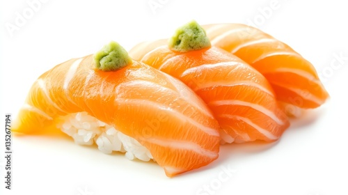 sushi, salmon, topping, wasabi, eating, preparing, serving, raw, rice, japanese food, asian cuisine, cookery, seafood, dish, meal, lunch, dinner, fresh, ingredient, healthy, traditional, epicure, studio shot, isolated, closeup, food photography, white background, bright, orange, green, macro, cut-out, minimalist, delicious, eatery, menu, lifestyle, culture, cooking