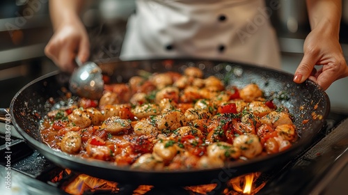 seafood, scallop, tomatoes, parsley, cooking, chef, kitchen, food, delicious, culinary, gastronomy, eatery, dinner, meal, dish, cookery, receipe, ingredient, preparation, professional, hot, pan, saute, spicey, appetising, tasty, flavorful, fresh, healthy, epicure, lunch, brunch, plate, serving, eating