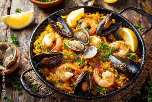 paella, seafood, dish, rice, prawn, mussel, clam, lemon, parsley, food, tapas, spanish, cookery, cooked, meal, dinner, plate, pan, wooden, table, background, vibrant, appetising, colourful, healthy, delicious, flavorful, epicure, traditional, fresh, ingredient, closeup, eatery, lunch, tasty, image, food photography, deliciously, hot