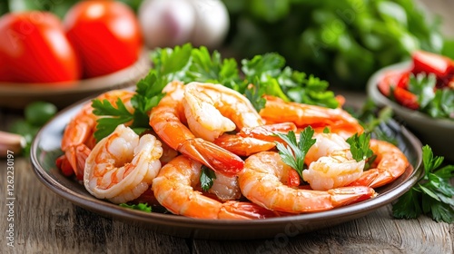 Delicious shrimp cocktail served on rustic wooden table with fresh herbs and vegetables