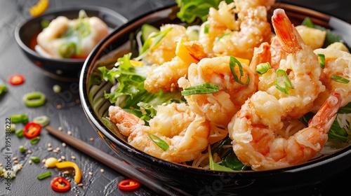 Delicious shrimp dish served with fresh vegetables and herbs in a stylish black bowl, perfect for food photography.