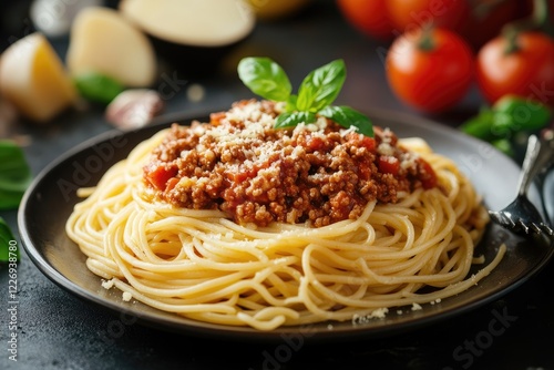 spaghetti, bolognese, pasta, food, italian food, dish, meal, dinner, lunch, cookery, delicious, tasty, tomatoes, meat, sauce, cheese, grated cheese, basil, herb, spice, plate, table, eatery, cafes, menu, cooking, receipe, homemade, fresh, healthy, nourishment, epicure, traditional, background, closeup, topview, dark background, black background, serving, cooked, ingredient, italy, parmesan