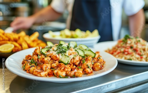 Delicious Spicy Chicken Salad with Cucumber and Parmesan Cheese Restaurant Food Dish Close up view of tasty gourmet meal