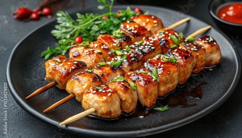 skewer, grilled chicken, japanese food, sesame seeds, herb, dinner, meal, asian cuisine, cooking, receipe, culinary, bar-b-q, tasty, flavorful, garnishing, black plate, epicure, succulent, healthy eating, homemade, soy sauce, marinade, culinary arts
