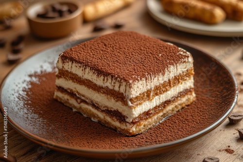 tiramisu, dessert, cake, chocolate, cocoa, hot drink, cream, ladyfingers, biscuit, sweet, treat, pastry, italian, cookery, food, delicious, deliciously, tasty, rich, decadent, creamy, smooth, layer, brown, powdered, sugar, coffee bean, plate, dark, wood, table, background, texture, photo, image, closeup, appetising, indulgence