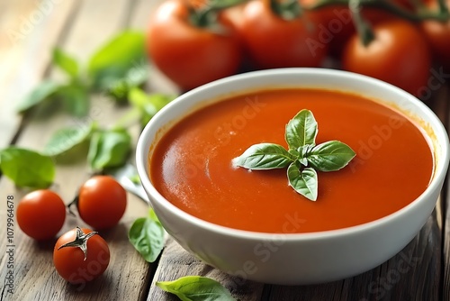 Delicious tomato soup in a bowl on a wooden background, selective focus.