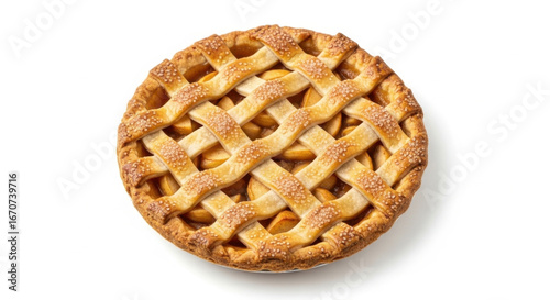 Delicious whole apple pie with lattice top crust and sugar crystals isolated on white background ready for dessert