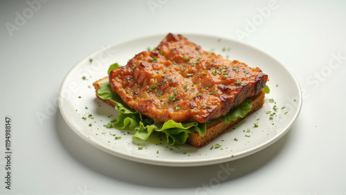 Deliciously prepared open-faced sandwich with savory toppings resting on a crisp lettuce bed