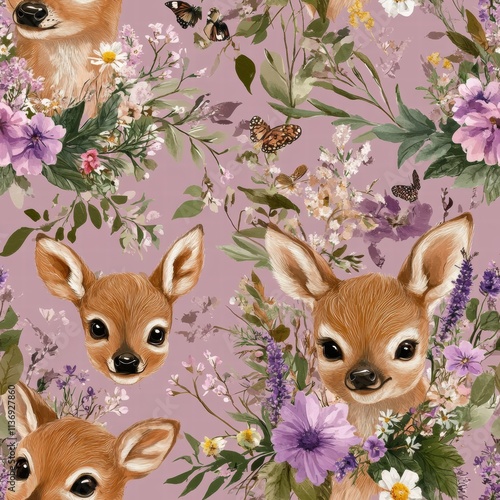 cervid, floral, pattern, seamless, nature, design, flower, butterfly, wildlife, calmness, colours, art, illustration, foliage, cute, charme, fauna, beauty, aesthetic, serene, purple, greenery, vibrant, whimsical, decorative, spring, creativity, organic, pastoral, meadow, enchanting, artisanal, pastel, innocence, wild, blossom, environment, lush, playful, generative, ai