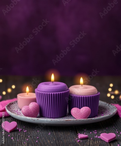 valentine, cupcake, frosting, nubes, plate, purple, pink, love, dessert, treat, celebration, romance, sweet, confection, gift, sugar, party, snack, decoration, festive, indulgence, favor, happiness, joy, surprise, bake, occasion, affection, delight, beautiful, charme, creation, passion, sweetness, invitation, warmth, togetherness, whimsy, magic, bliss, heartwarming, adornment, day, holiday, background, poster