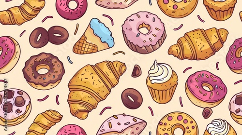 Delightful and Delicious Pattern of Assorted Doughnuts, Croissants, and Cupcakes