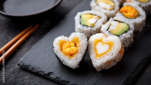 Delightful Heart-Shaped Sushi Rolls with Colorful Fillings on Slate Plate Surrounded by Chopsticks and Soy Sauce Dish