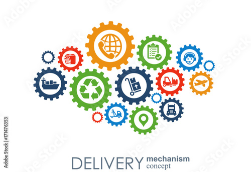 Delivery mechanism concept. Abstract background with connected gears and icons for logistic, service, strategy, shipping, distribution, transport, market, communicate concepts. Vector interactive