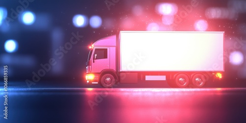 Delivery truck on a blurry urban background with colorful lighting effects.