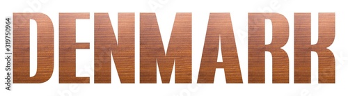DENMARK word with brown wooden texture on white background.