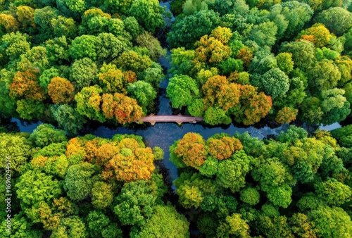 canopy, tree, forest, foliage, autumn, fall, water, stream, river, bridge, aerial, view, green, yellow, orange, nature, landscape, wood, thick, dense, sunlight, outdoors, treetop, up high, overhead, natural, background, season, seasonal, scenic, vibrant, colourful, peaceful, serene, calmness, park, timberland, picturesque, vista, idylli, wild, ecosystem, environment, preservation, conservation, wilderness, growth