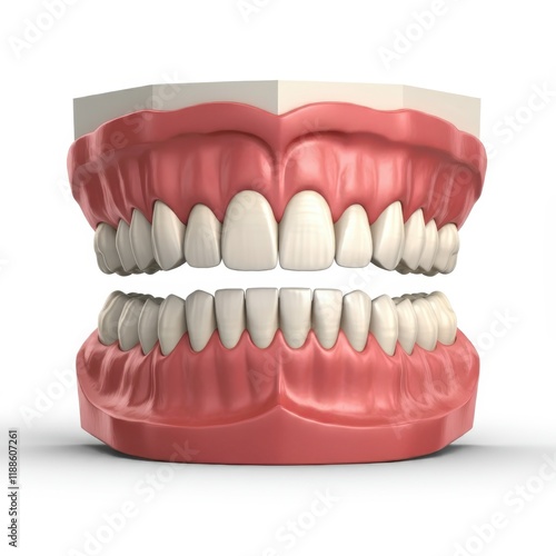 Dental model, full set of teeth, realistic gums, 3D render, anatomical detail, dental education, oral hygiene, white teeth, pink gums, close-up view, medical illustration, dental prosthetics, high res