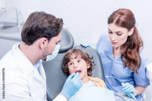 dentists examining teeth of little boy in dental hospital