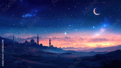 desert, sunrise, moon, star, sky, city, landscape, night, mystical, ramadan, sand, dune, mountain, architecture, silhouette, horizon, twilight, dawn, religious, spiritual, faith, hope, peace, calm, serene, beauty, nature, travel, adventure, exotic, magical, ancient, culture, history, illustration, artwork, background, image, photo, astronomy, cosmos, universe, crescent, islam, prayer, meditation, spirituality