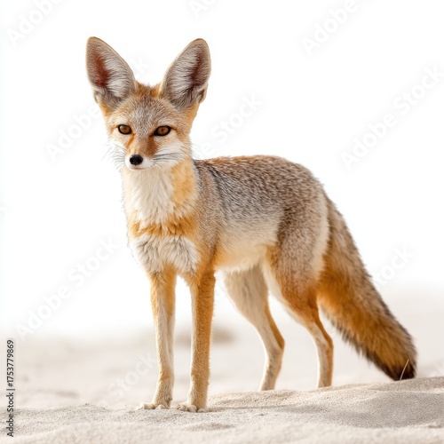 Desert Fox Standing Proudly on Sand, Ears Perked, Looking Directly at Camera.