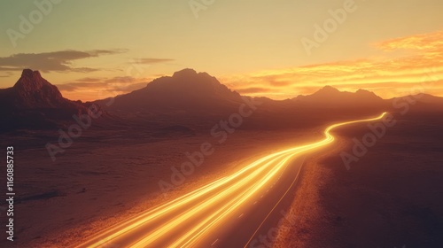 road, highway, desert, sunset, sunrise, mountain, landscape, light, trail, travel, journey, adventure, speed, fast, motion, dusk, dawn, horizon, sky, cloud, orange, yellow, brown, scenic, view, nature, background, texture, path, way, direction, distance, freedom, open, huge, empty, solitude, serene, peaceful, calm, gold, heat, arid, remote, wild, exterior, panorama