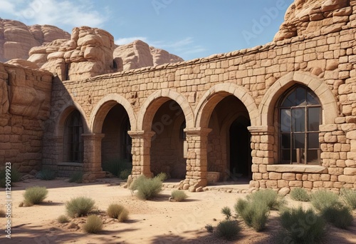 Desert landscape with ancient stone convent building and arched windows , ancient stones, arched windows, Convent in the Desert