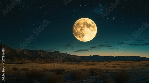 Desert night with a full moon and starlit sky above the mountains, quiet landscape