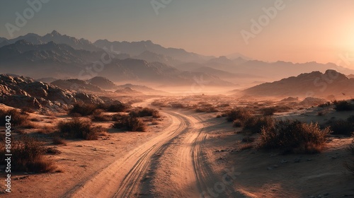 Desert Road Trip Adventure Scenic Landscape with Mountains Trails and Golden Sunlight View in Arid
